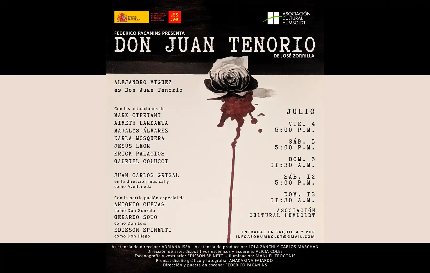 Con el apoyo de la Embajada de España en Venezuela y la Asociación Cultural Humboldt, Federico Pacanins presenta la obra “Don Juan Tenorio”, cuyo personaje central, precedido por su reputación de seductor desenfrenado, logra la redención de su alma al enamorarse genuinamente de la virtuosa Doña Inés.