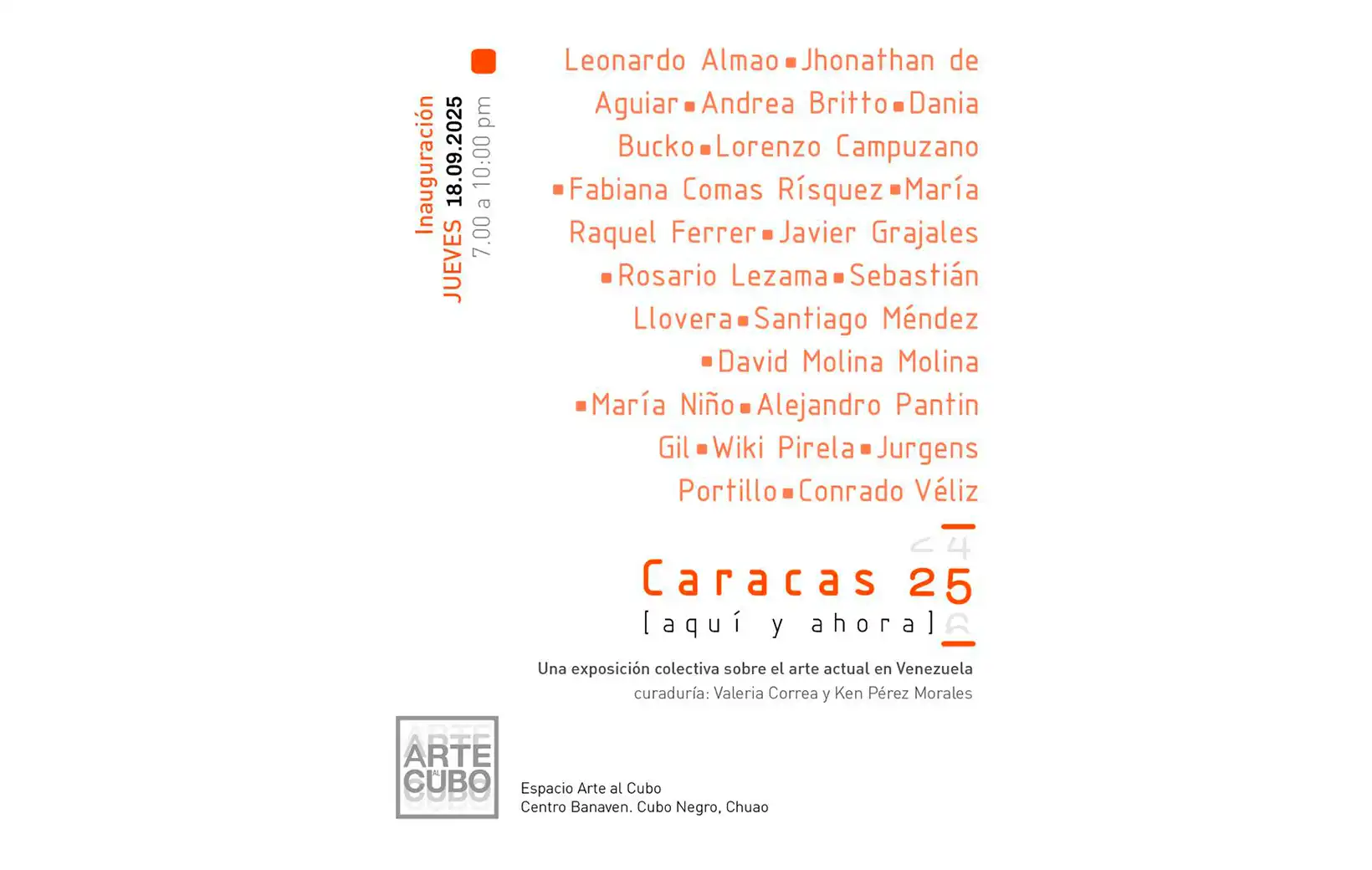 Una selección de obras de diecisiete artistas jóvenes venezolanos, conforman la exposición colectiva Caracas 25. Aquí y ahora, que será inaugurada en Espacio Arte al Cubo el jueves 18 de septiembre de 2025, a las 7:00 p.m., bajo la curaduría de Valeria Correa, la asistencia curatorial de Ken Pérez Morales y la museografía del joven arquitecto Eduardo Zambrano.